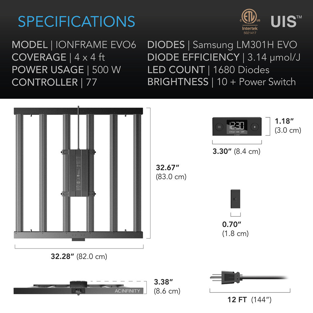 AC Infinity IONFRAME EVO6 – Samsung LM301H EVO Commercial LED Grow Light, 500W, tot 120 x 120 cm