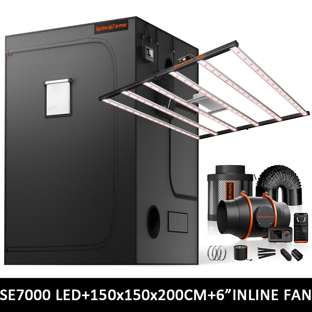 Spider Farmer SE7000 Kweek Tent Kit Compleet – 150×150×200 cm Tent + 730W Full Spectrum LED + Nieuw 6″ Inline Fan met GGS Controller